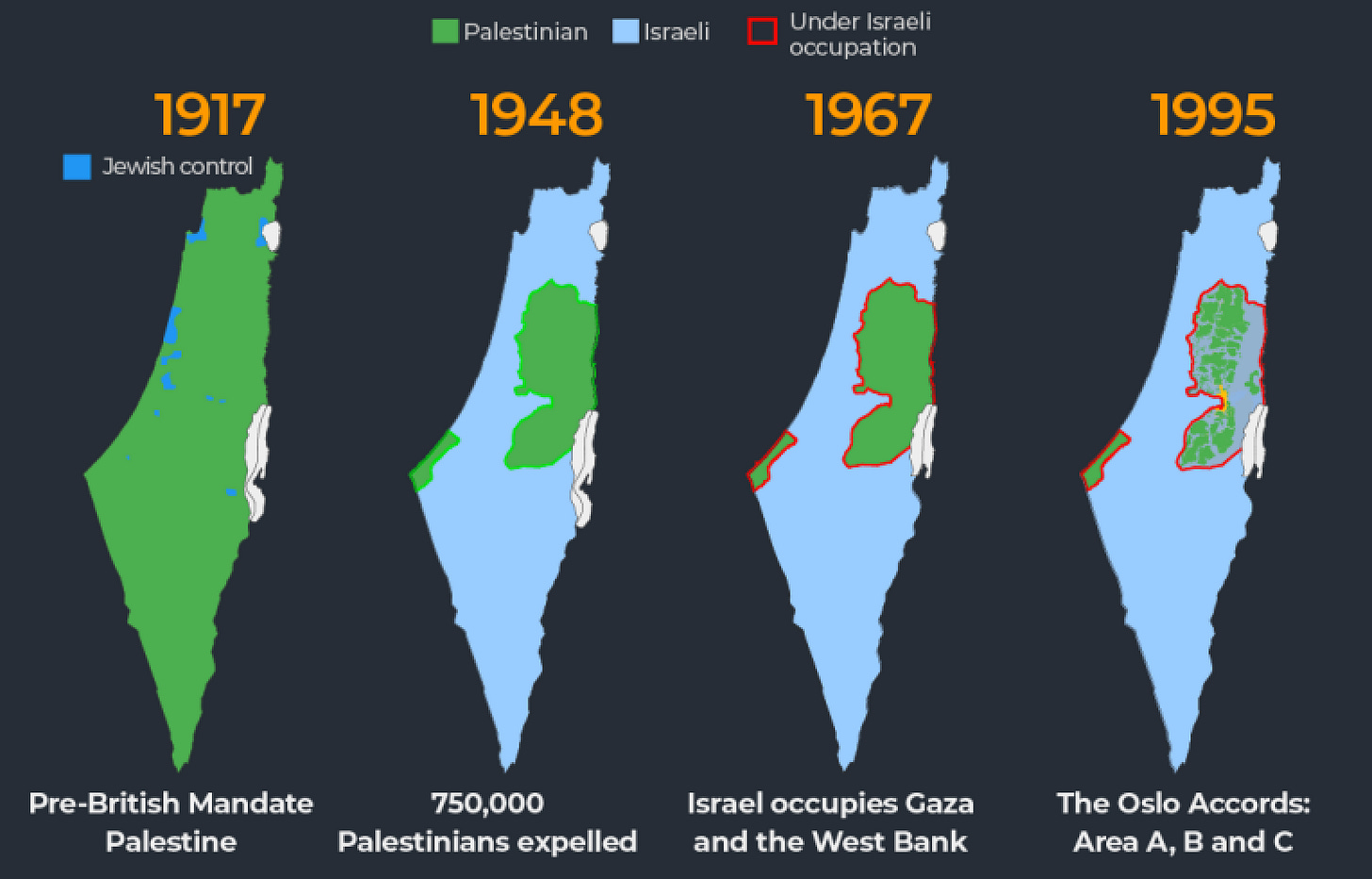 The closest Israel and Palestine ever got to reaching an agreement was the 1993 Oslo Accords. At that point, Palestine had abandoned the dream of reclaiming the land that was stolen from them in 1948 (and again in 1967) and agreed to recognise Israel in return for control over Gaza and the West Bank. The Israeli Prime Minister at the time, Yitzhak Rabin, refused to recognise Palestine. He would only go so far as to recognise “a Palestinian entity which is less than state.” Needless to say, the Oslo Accords fell short of delivering Palestinian statehood and Israel’s occupation continued.